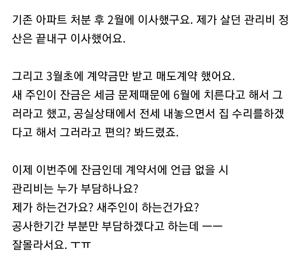 오늘 부동산 중개인한테 연락왔는데 공사한 기간 3월3분의1은 매수자가 부담하고 나머지 3분의2 그리고 4월5월 저보고 관리비 부담하라고 하네요. 최악의 경우 법정다툼으로 갈시 재산훼손으로 손해배상 청구 가능한가요?