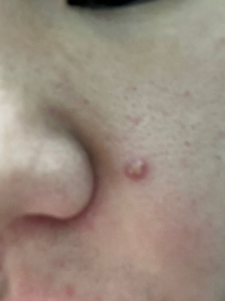 여드름의 일종으로 보이고 스스로 손을 댈 경우 상처를 통한 감염, 흉터의 문제가 생길 수 있어 피부과 치료를 받을 것을 권합니다.