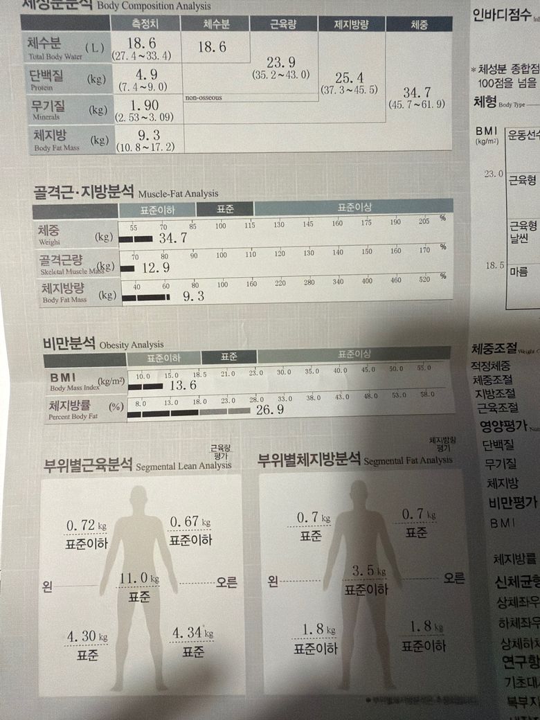인바디 결과와 현재 겪고 계신 증상들을 보니 고생이 많으실 것 같습니다. 대사 회복이 필요합니다. 현재 질문자님 신체조성은 BMI 13.6으로 마른 수준을 넘어 몸이 스스로 갉아먹고 있는 상황입니다.