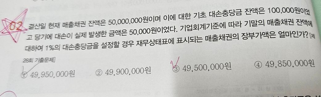 (대손충당금 설정액이 매출채권의 1%이므로 대손충당금은 50,000,00의 1%인 500,000이 되어야합니다.)