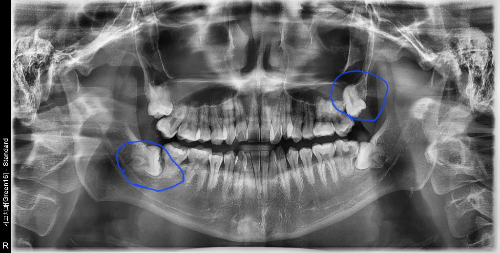1, 위의 사랑니가 경사져 매복되어 있으며 특이 오른쪽 위으 사랑니는 고난이도 수술이 필요할 것으로 보입니다. 구강외과 전문의에게 가는 것을 추천합니다. 2. 위의 사랑니도 2-3일간 붓고 아프고 할 것으로 보입니다.