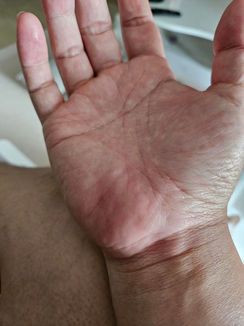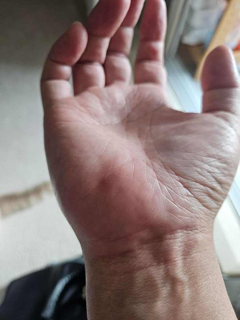 지금 자고 일어났는데 갑자기 손목과 연결되는 오른손바닥이 벌겋게 부어오르고 간지러워여ㅠ 염증일까여? 두드러기 일까여?