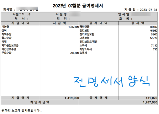 아래 급여명세서로 월급을 받는데 불이익 없는지?
