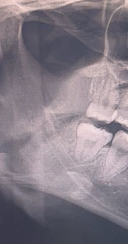 뒤쪽으로 잇몸뼈 덮혀 있어 잇몸뼈 삭제해야 이가 빠질 가능성이 있습니다. 수직매복이 더 어려운 케이스도 있지만 지금 케이스는 그렇게 어려울 것 같지는 않습니다.