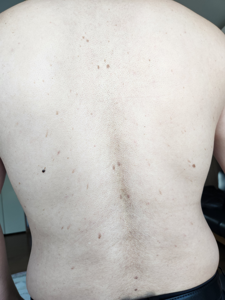단순모반과 섬유종 편평사마귀 등이 섞여 있는 양상으로 보입니다. 너무 걱정하실 병변은 아닌 듯 하지만, 정확한 진단 및 치료를 위하여 가까운 피부과를 찾아 신체검진과 더모스코피 검사를 받는 것을 권유드립니다.