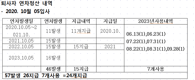퇴사자 연차 정산을 하고있습니다. 입사일 2020.10.05 / 퇴사일2023.10.31 입니다.
