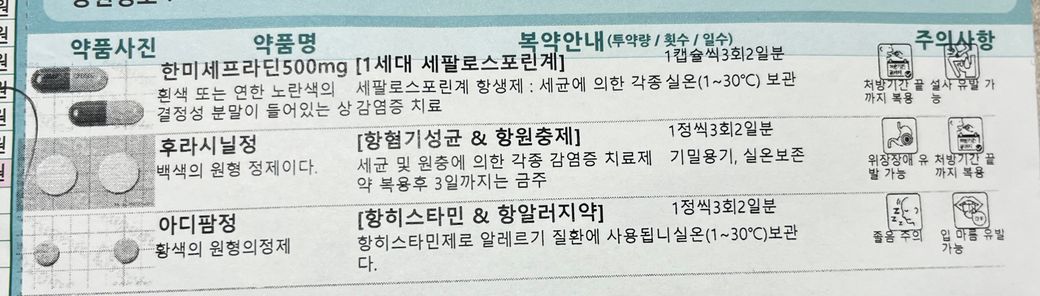 아래 처방전 약은 모두 드시고, 위에 처방전은 후라시닐정만 드시길 바랍니다.