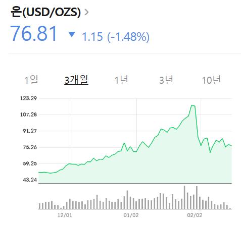 최근 3개월 간 아래 그래프를 보시면 은 가격은 폭등했고 2월 초 말씀하신 대로 30% 가까이 하루만에 폭락하기도 했습니다.