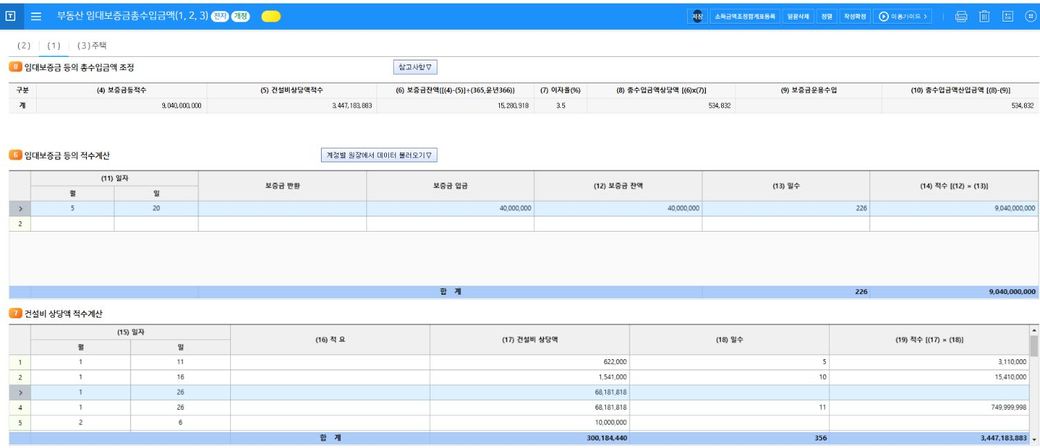 부동산임대보증금총수입금액 서식에서 (1)건설비 상당액 적수계산에서 아래 사진과 같이 날짜별로 금액 입력하면 되는건가요?