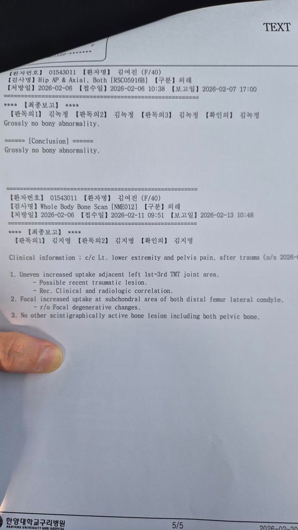 결과를보면 X-ray 에서는 뚜렷한 골절은 보이지 않았습니다. 하지만 뼈 스캔에서는 왼쪽발 1~3번째 종족부에 외상 후 변화가 보이며, 이는 미세걸정이나 뼈 타박상 가능성을 의미합니다. 큰 골절은 아니지만 사고로 인한 뼈 반응은 맞습니다. 무릎 쪽 소견은 퇴행성 변화 가능성으로 외상과는 크게 관련없어보이고, 골반 포함 다른부위는 이상이 없습니다. 현재통증은 수술이 필요한 심한 골절보다는 외상 후 미세손상이나 연부조직 손상때문일 가능성이 크며 보통 시간이 지나면서 호전됩니다. 답변이 도움이 되셨길 바랍니다!
