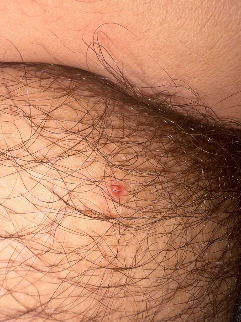 사진상 병변은 다음 특징을 보입니다. 중심에 작은 구멍 또는 딱지처럼 보이는 부위가 있고, 주변으로 국소적인 발적이 동반된 단일 병변이며, 털이 있는 부위입니다. 이 형태는 곤지름이나 헤르페스보다는 모낭염 또는 인그로운 헤어(털이 피부 안으로 말려 들어간 상태)에 더 합당합니다.