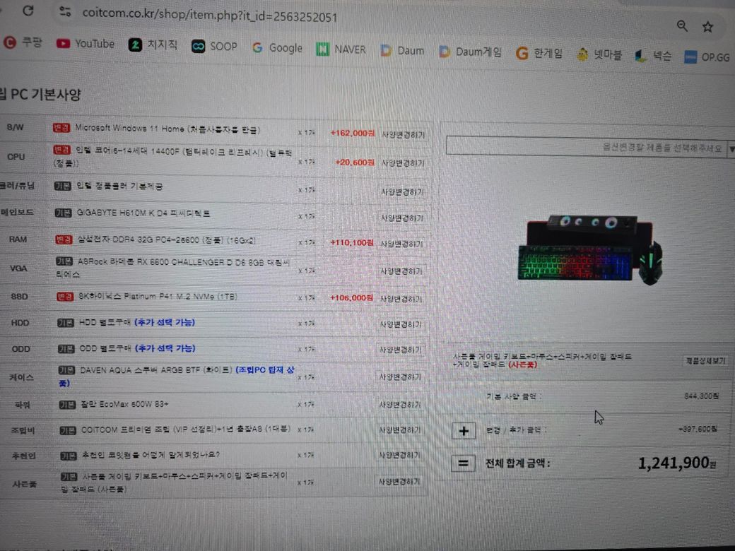 코잇컴에서 견적보신 거 같은데 다나와나 코잇컴이나 인터넷에서 견적 짜는 거면 가격은 거기서 거기입니다. 부품은 요즘 잘 팔리는 것들로 구성 돼 있고, 벤치상으로는 성능이 더 좋고 잘 맞는 부품들이 있긴 하지만 체감하기는 사실 힘들기 때문에 그냥 자기가 마음에 드는 걸로 사는 게 좋습니다. 그렇게 구매하시고싶으시면 구매하셔도 됩니다. 고사양게임하거나 편집 하는 거 용도로 맞는 거 같고, 그런 용도가 아니더라도 본인이 거기에 삘이 꽂혔다면 어쩔 수 없겠죠.