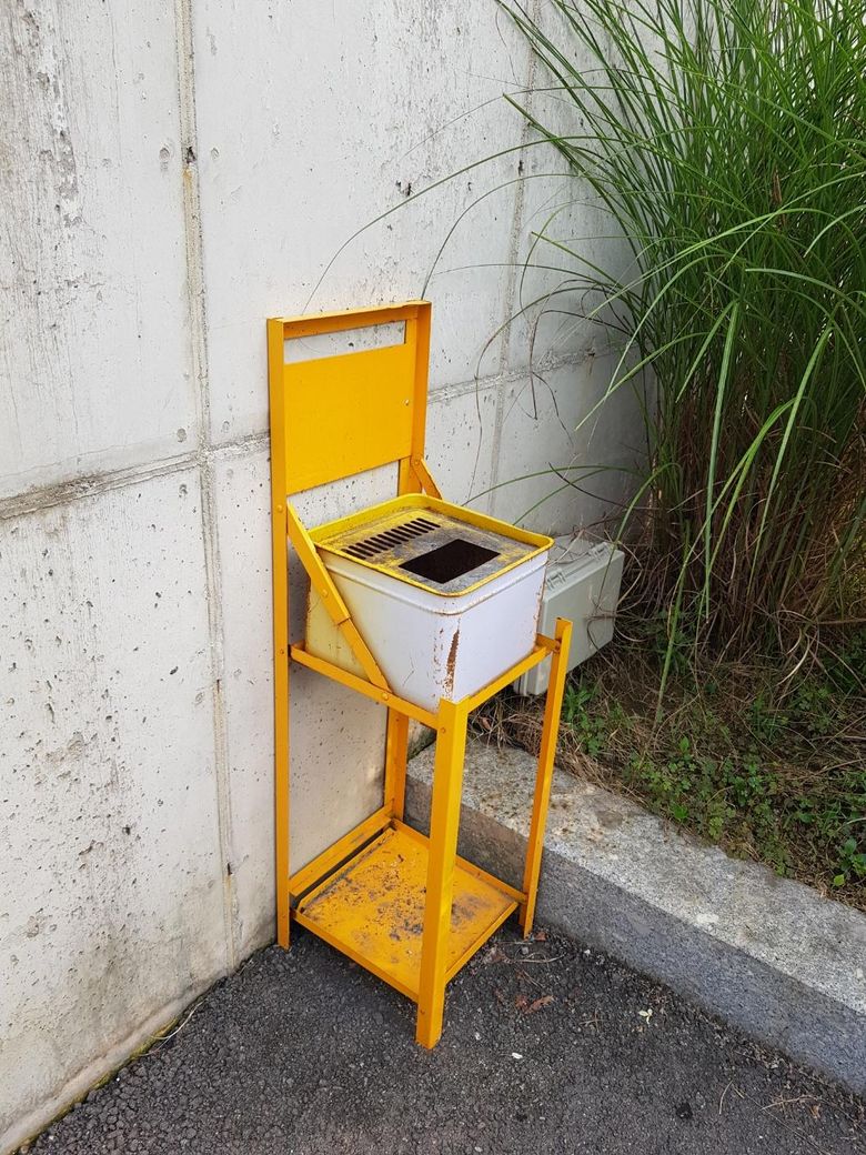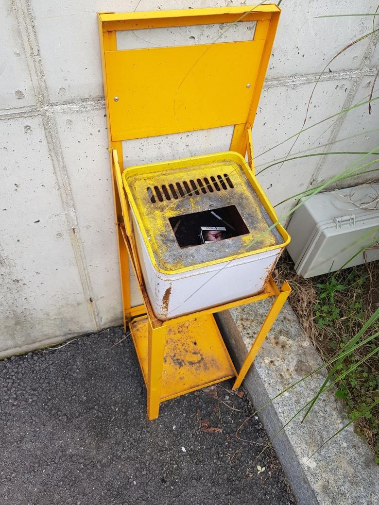 이건 예전에 사용하던 재떨이 입니다. 내부에 모래가 들어있고 금속 부분에 꽁초를 버리를 형태 입니다. 과거에는 길에서 흡연도 되었던 시기에 사용하던 제품입니다. 요즘은 흡연 구역이 정해져있고 단속이 심해졌기에 거의 사라졌는데 잘 가지고 계셨던 모양입니다.