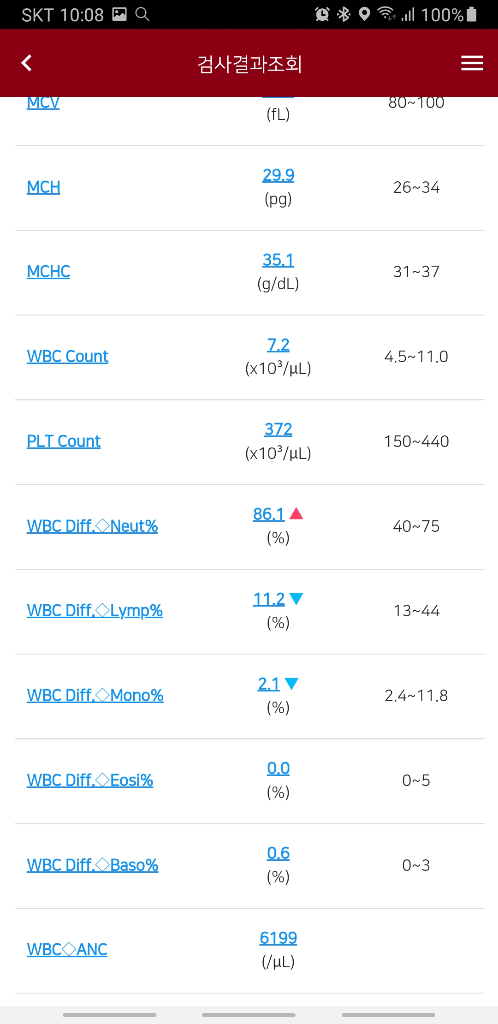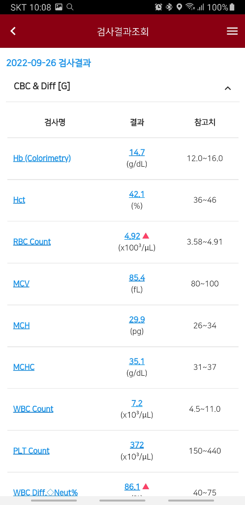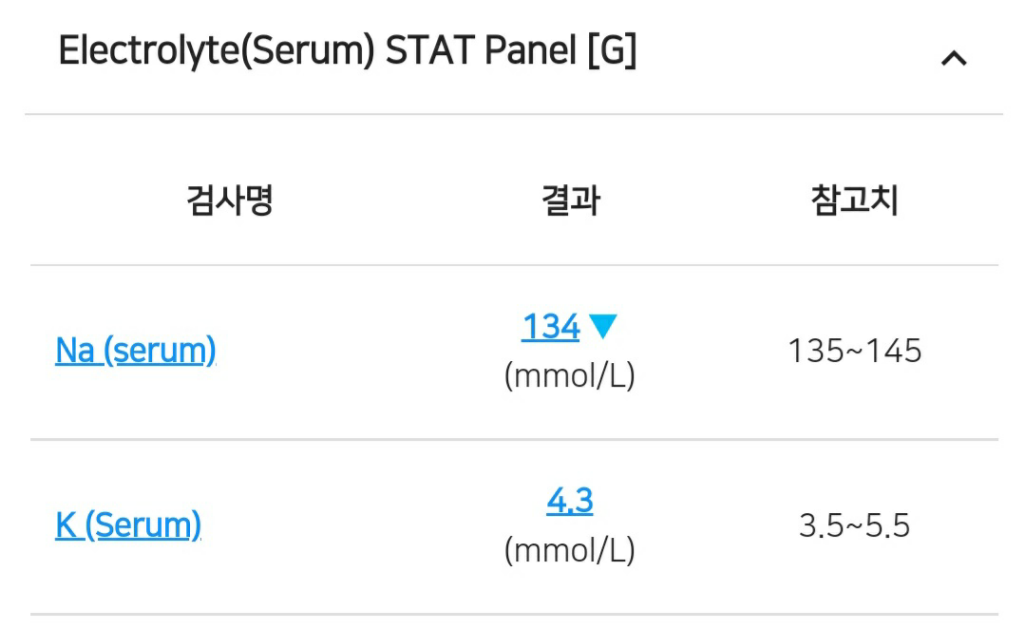 속이 안좋아서 4일간 밥과 물을 잘 못먹었습니다. 계속 토를 해서... 그러다가 탈수가 오는게 몸으로 느껴져 물이라도 마시기 시작했는데 탈수가 심했던건지 물을 먹어도 먹어도 계속 갈증이 나더라고요. 3일간 하루에 물을 5리터씩 먹었습니다. 그러고 다음날 병원 검진이 있어서 병원에 가서 받은 피검사 결과 입니다. 의사선생님은 저한테 별 문제가 없다고 말씀해주셨었는데 집에 와서 병원 어플로 검서결과를 보니 수치가 증가한 것과 감소한 것들이 있더라고요. 어떤걸 의미하는지 자세히 알고싶습니다. 그냥 피검사 괜찮네요. 이 한마디 듣고 병원을 나온거라 검사결과에 대한 자세한 해석은 듣지 못했습니다. 정상인 수치들은 설명 안해주셔도 되는데 빨갛고 파란 수치들은 자세히 설명해주시면 감사하겠습니다.