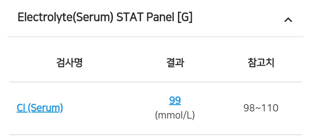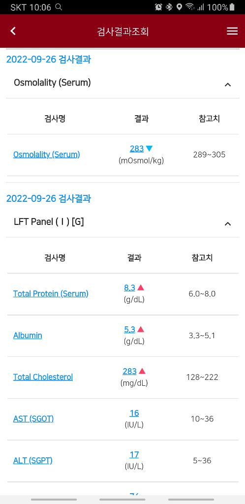 현재 콜레스테롤이 높은 것 외에는 특별한 소견을 찾기 어렵습니다. 탈수에 나타나는 신기능 저하나 전해질 불균형도 관찰되지 않습니다.