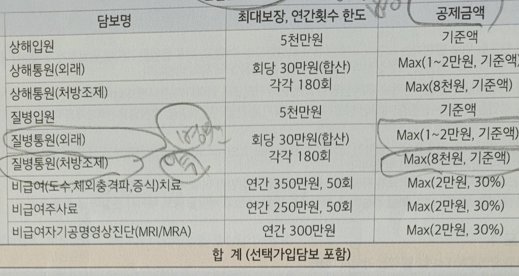 - 각각 통원, 처방에 공제금액이 적용됩니다.