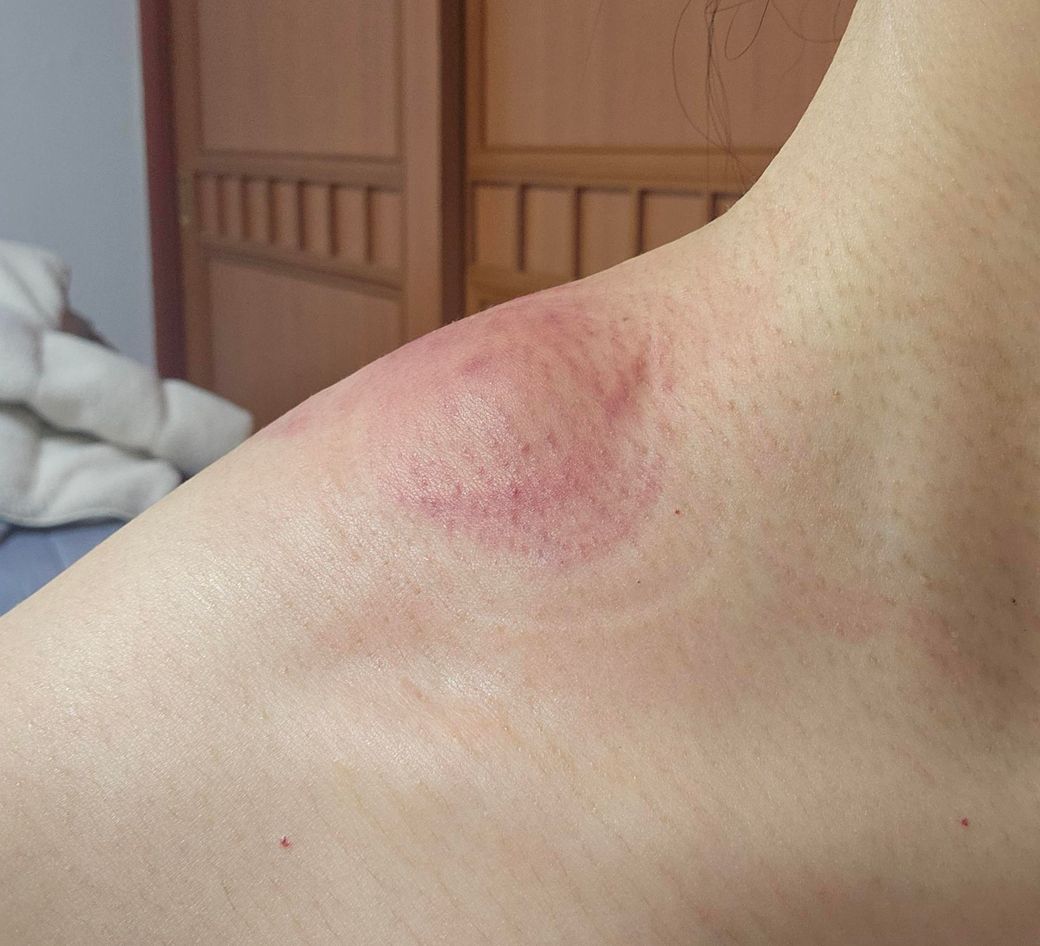 현재 양상에서 더 가능성이 높은 것은 주사 후 발생한 국소 염증 반응, 피하 혈종(피부 아래 멍), 또는 주사로 인한 연부조직 손상에 따른 부종입니다. 특히 통증과 급격한 부종이 함께 나타났다면 혈종이나 염증성 반응이 상대적으로 흔한 원인입니다. 이후 부항이나 흡입 마사지로 인한 추가적인 피하 출혈이 겹치면서 사진처럼 붉고 퍼진 멍 양상이 나타났을 가능성도 있습니다.