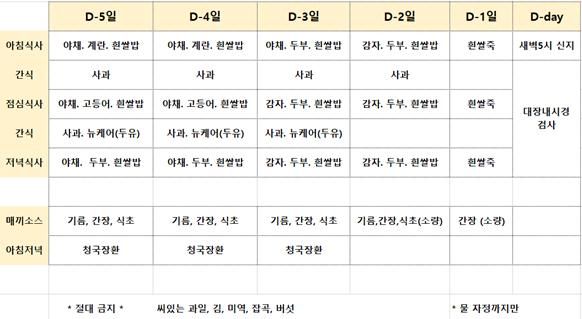 현미밥은 절대 금지입니다. D-5일부터 D-1일까지 모두 완전 백미로 교체해야 합니다. (쌀밥만 하신건 아주 좋습니다.)