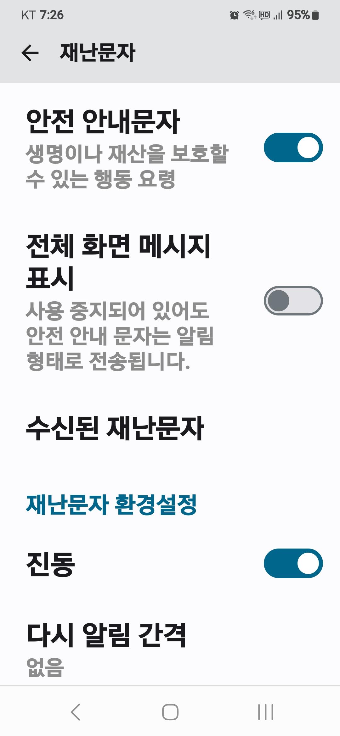 재난문자 클릭하면 쭉뜬것을 모두다 비활성화 시키시면 됩니다 초록색을 아래와 같이 표시되게 하면 재난문자 안옵니다