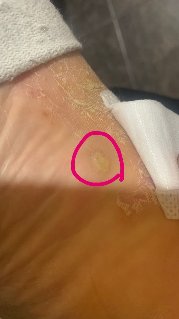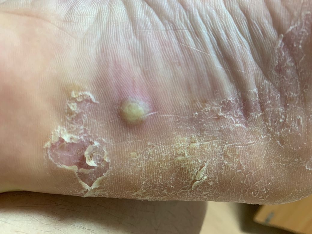 이틀 전 갑자기 발바닥이 엄청 아프길래 봤더니 티눈처럼 발바닥 가운데에 뭐가 있길래 다음날 병원가려고했는데 다음날 이게 물컹거리고 물집처럼 말랑해졌습니다 그날 저녁 샤워하고 나왔는데 노란 물집이 살짝 터져서 면봉으로 짜냈는데 이게 뭔지 궁금합니다