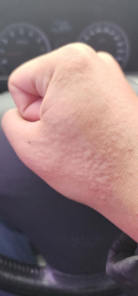 사진상 손등에 경계가 불분명한 팽진 형태로 보이며, 전형적인 두드러기 형태와 유사합니다. 다만 말씀하신 것처럼 가려움이 없고 국소 부위에만 발생했다는 점은 약간 비전형적입니다.