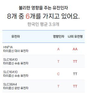 얼마전에 유전자 검사를 통해 결과를 받았습니다. 결과중에 사진과 같이 타이로신 대사 및 흡수율에 취약할 수 있다는 유전자가 있다고 해서요. 해당 유전자가 있으면 타이로신의 체내 농도가 선천적으로 낮을 수 있거나 관련 영양소를 충분히 섭취해도 문제가 될 수 있는지 우울증에 취약할 수 있는지 문의 드립니다.