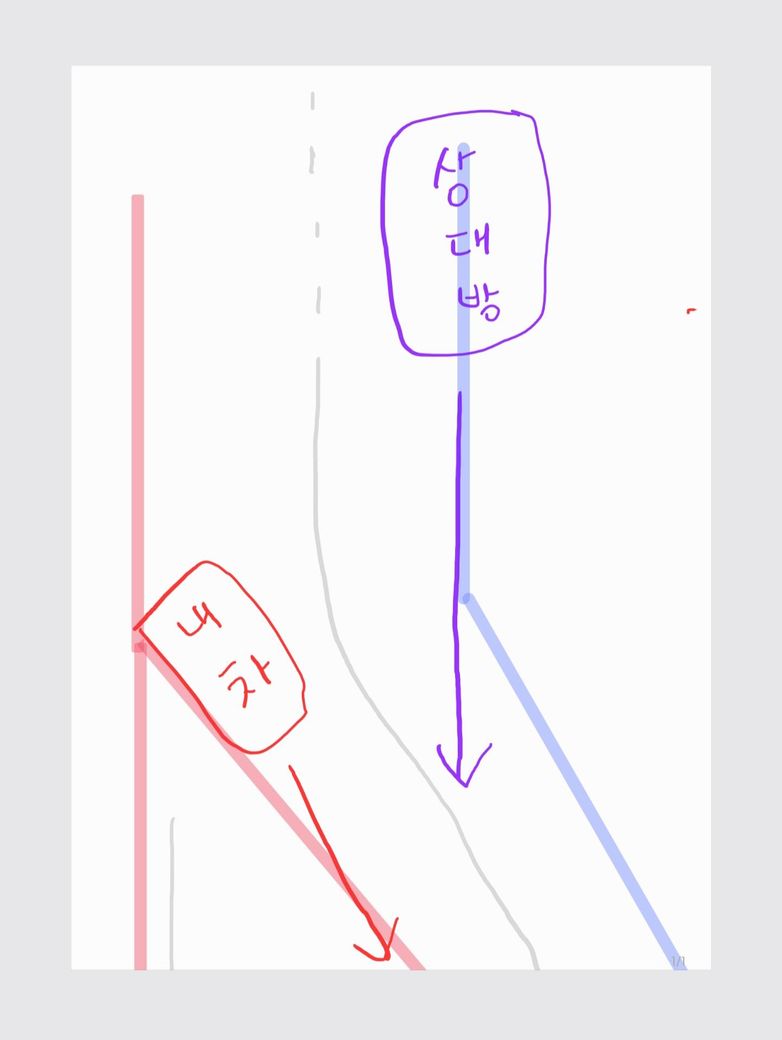 상대방은 파란색 유도선 따라가다가 실선 무시하고 직진하였고 저는 핑크색 선 따라서 가고 있었습니다