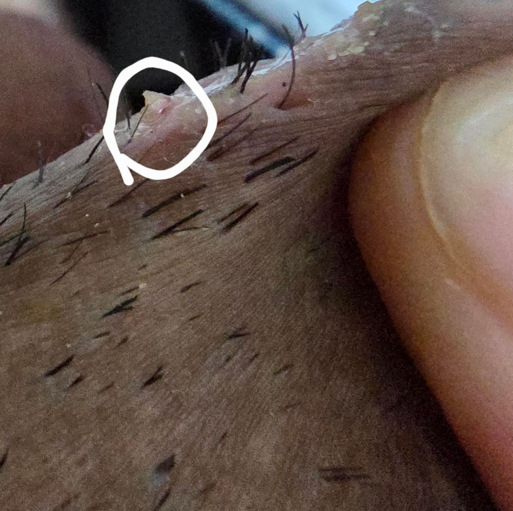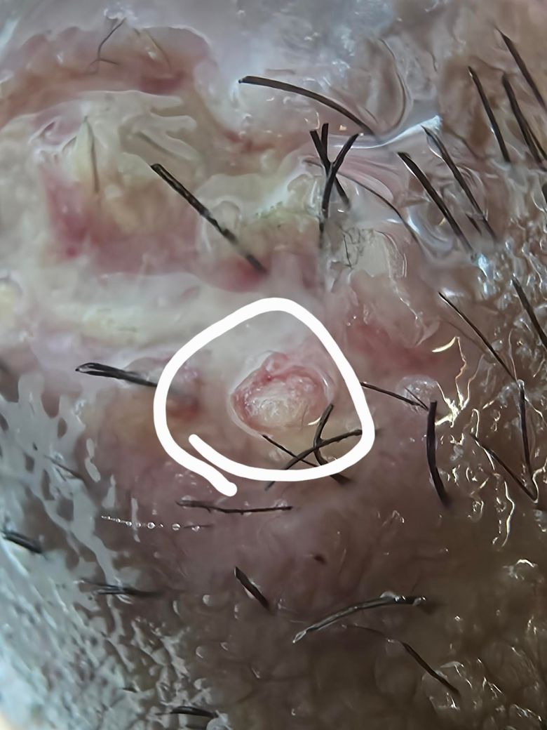 사진상 병변은 중심에 흰색 각질성 내용물이 있고 주변이 약간 홍반을 띠는 작은 구진 형태입니다. 표면이 사마귀처럼 울퉁불퉁하거나 꽃양배추 모양의 유두상 증식은 뚜렷하지 않습니다. 한 번 압출했을 때 흰색 내용물이 나오고 출혈이 있었다는 점을 고려하면, 현재 소견은 재발성 곤지름보다는 모낭염 또는 표피낭종(epidermal inclusion cyst) 혹은 시술 후 각질/딱지 형성 가능성이 더 높아 보입니다.