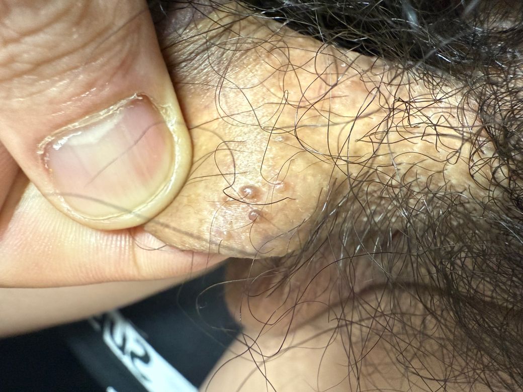 몇달전부터 생겼는데 별 생각없이 방치 해뒀습니다. 가려움이나 통증은 전혀 없는데, 그냥 어느순간 거슬려서 질문하기 됩니다. 혹시 뭘까요? 성기 기둥쪽입니다