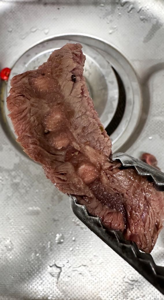 소고기를 구웠는데 굽고나서 보니 힘줄 부위에 흰색의 아주 살짝 튀어나온 점? 같은게 있습니다.