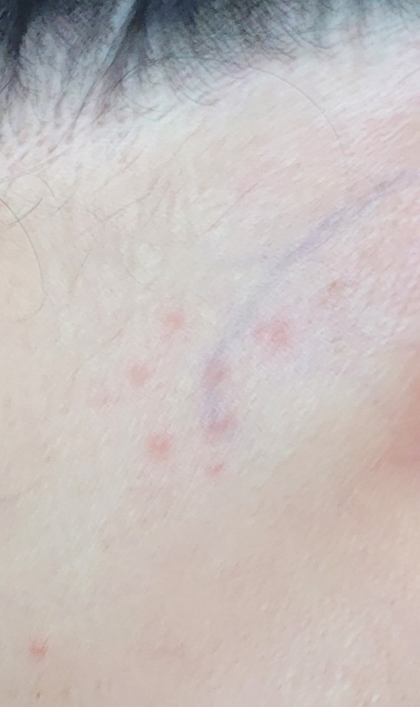 사진으로 볼때는 단순 접촉 알러지로 보입니다. 그러므로 알러지 약을 복용하거나 경과관찰 하시는것을 추천 드립니다. 점점 번지는양상이라면 피부과 진료 받아보세요
