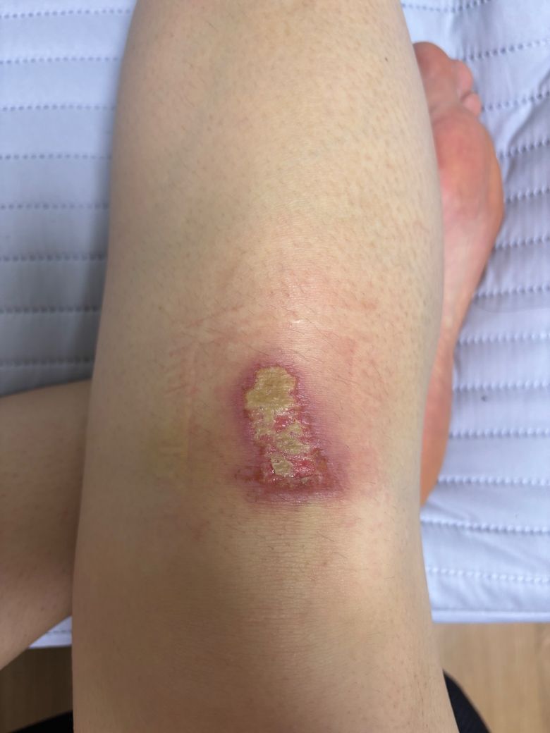 올려주신 사진에서 감염이 우려되는 소견은 뚜렷하진 않으나 가능성이 있으므로 상처 소독과 드레싱을 꾸준히 하며 주의 깊게 경과를 보기 바랍니다.