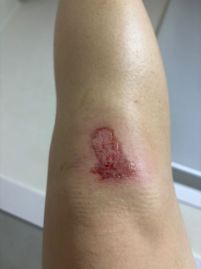 습윤 상태를 유지하는 것이 회복과 흉터 예방에 도움이 되므로 제거하지 말고 진물이 많다면 흡수력이 있는 밴드를 사용하되 세어나는 경우 즉시 교체하기 바랍니다.