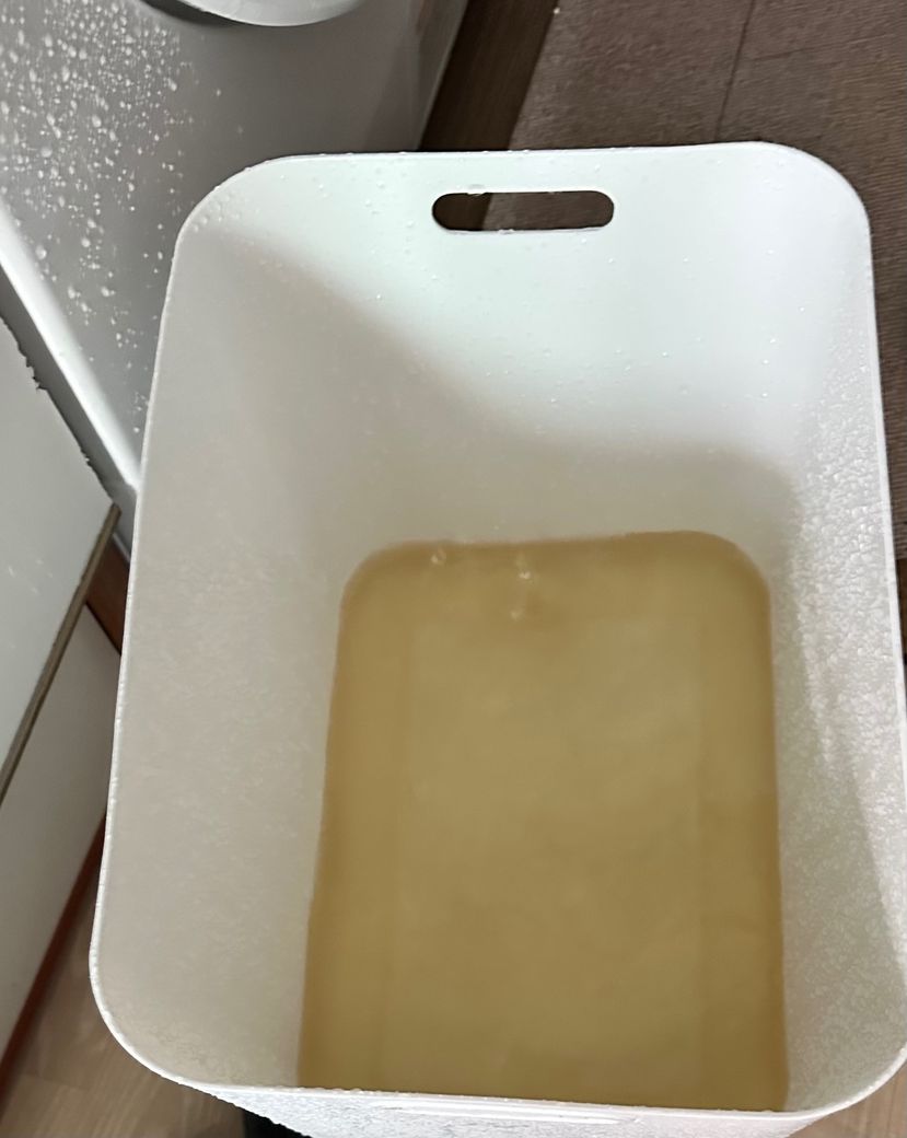 사진의 연갈색 물은 구조물 오염수 가능성이 더 높습니다. 천장 내부에는 단열재, 목재, 먼지, 녹, 곰팡이 등이 존재할 수 있어 누수 시 이런 물질들이 섞이면서 색이 변하는 경우가 흔합니다. 특히 오래된 건물일수록 녹물이나 유기물 혼입으로 갈색을 띠는 경우가 많습니다.