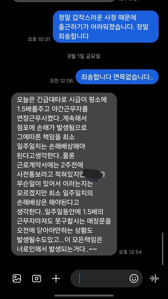 다른 알바생을 1.5배 급여를 주고 썼고 이 부분에 대한 손해배상을 요구할 것 같습니다.