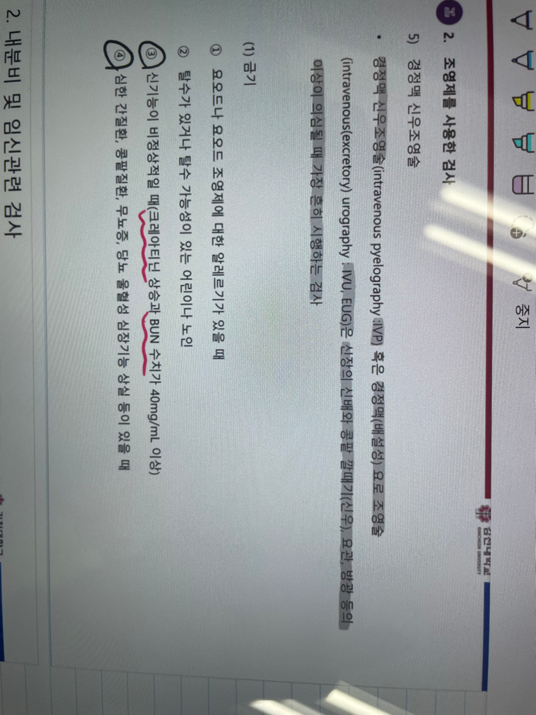 검사가 금기되는 대상자에는 신기능이 비정상일 때 금기라고 써져있어서 헷갈려요 ㅠㅠ