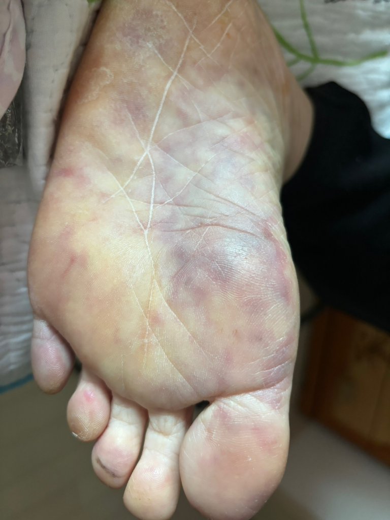 한 쪽 발바닥이 시퍼렇게 피멍이 들고