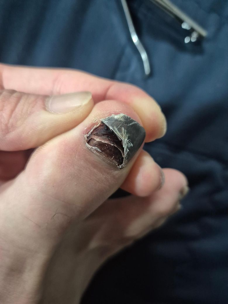 사진처럼 피멍 들었던 발톱이 들려 일부 제거된 상태라면, 연휴 동안은 소독만 잘해도 대개 괜찮습니다.