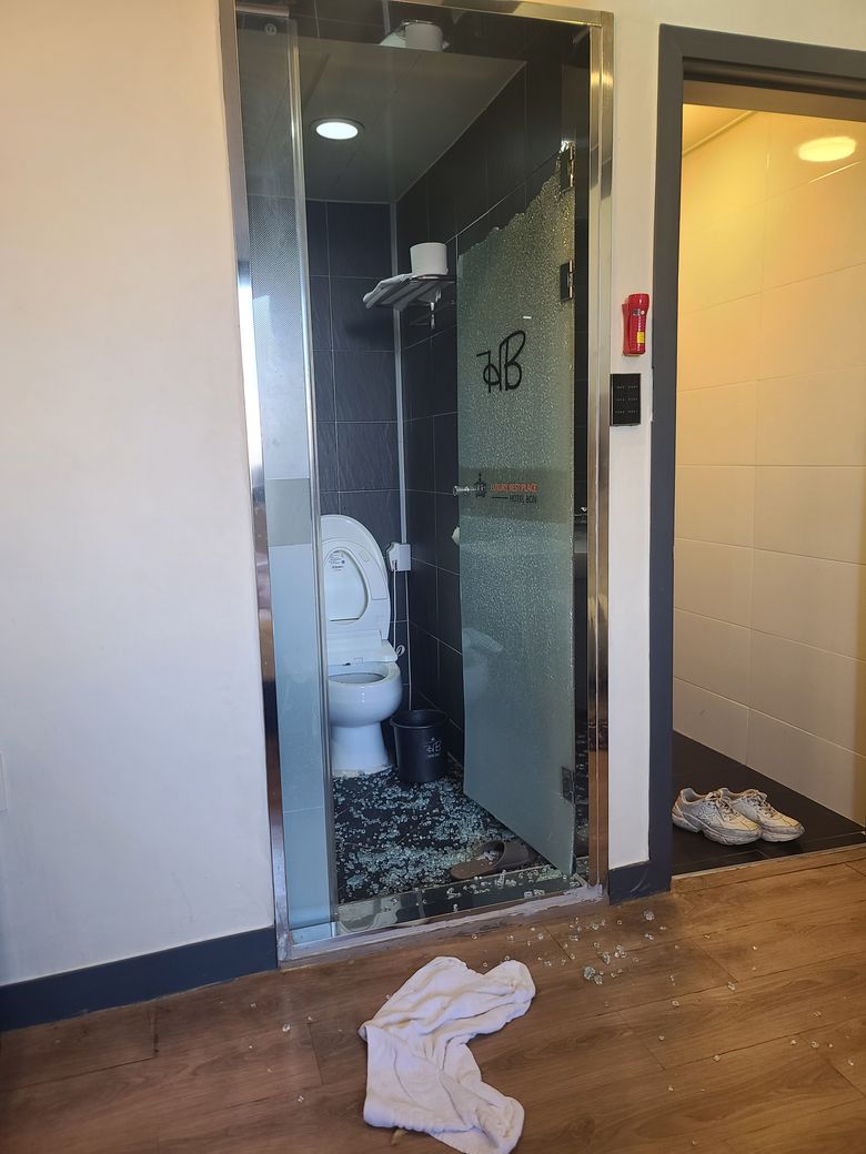 대전에 있는 호텔 본 이라는 곳에서 오전 7시 30분경 자고있었습니다 갑자기 펑하는 소리와 동시에 저는 일어났으며 처음에는 누가 밖에서 폭죽을 쏘고 있나했죠 화장실을 가려고 보니 화장실 강화유리가 부서져있었고 조금씩 떨어지고 있더라구요 그러다 사진을 찍어두고 7시 40분쯤에 호텔 사장님께 얘기를 하고 옷을 갈아입으려고 침대에서 내려간 순간 발에 유리가 박히고 발목을 접질러버렸습니다 호텔 사장님이 오시고 병원가보라고 하셨고 저는 일단 바닥에 유리를 쓸어달라고 부탁을 드렸습니다 그러다 방을 바꾸고 친구가 올때까지 가다렸습니다사장님 께서는 보험처리를 해주신다고 말씀을 해주신 상황이고 강화유리 부서진거 사진올리겠습니다