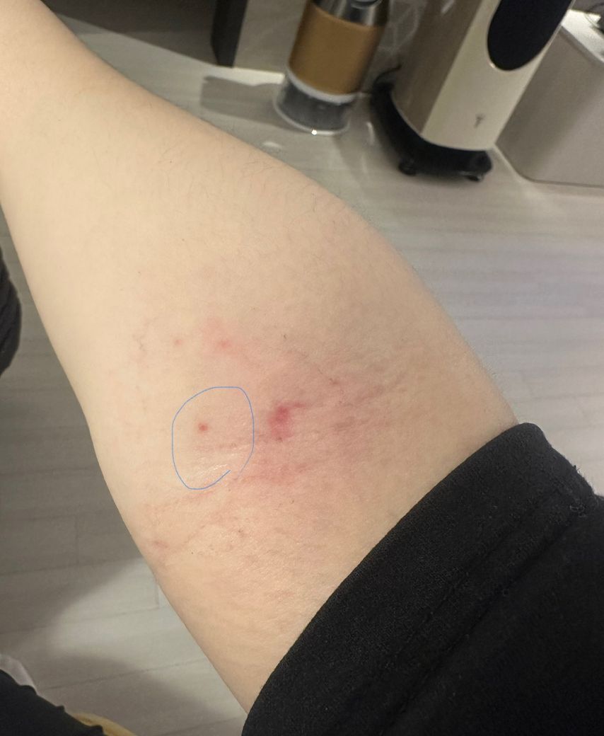 다음부터는 바늘을 뺀 자리를 5분 정도 문지르지 말고 꾹 눌러서 지혈해주시면 좋겠어요.