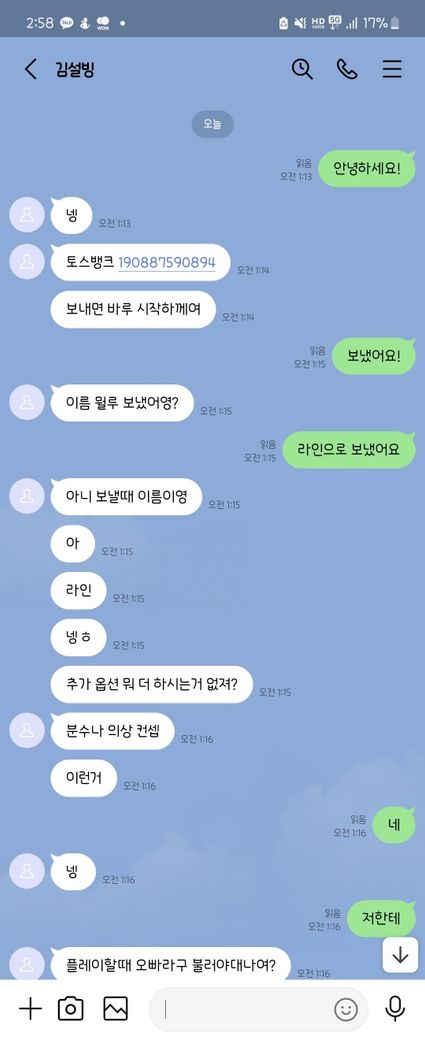 제가 트위터를 하던 중 , 호기심에 저도 모르게 "돈을 주면 영섹(영상통화를 통해 각자 자위행위를 하는 것)하겠다" 는 게시글을 통해 접근하여 라인이라는 메신저를 통해 toss 계좌이체를 하여 3만원을 지불하였습니다.