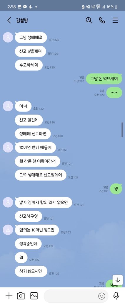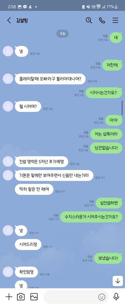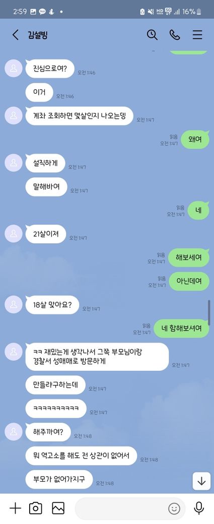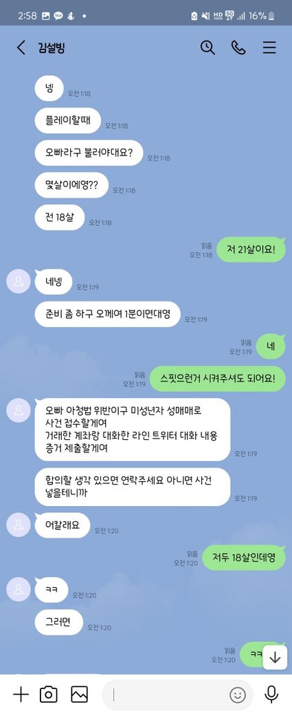 해당 부분의 대화내역은 아래와 같습니다.(순서는 아래에서 부터 위로 읽으시면 됩니다. ) (저는 22살 입니다. 해당 메신저에서는 급히 18살이라고 말하였습니다. )