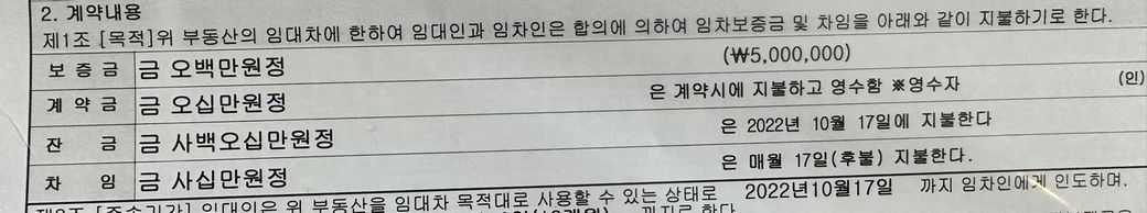 계약서를 자세히 살펴보면 보증금액이 오백만원이네요. 보증금을 계약금과 잔금으로 나누어서 계약시 50만원 지불하고 잔금일에 450만원 지불하고 입주했고요. 월세는 후불이니 1개월 거주하고 월세 지불하는 조건입니다.임차인 이주시에는 보증금 5백만원은 반환받고 월세는 1개월분 지불하고 이사하면 됩니다.