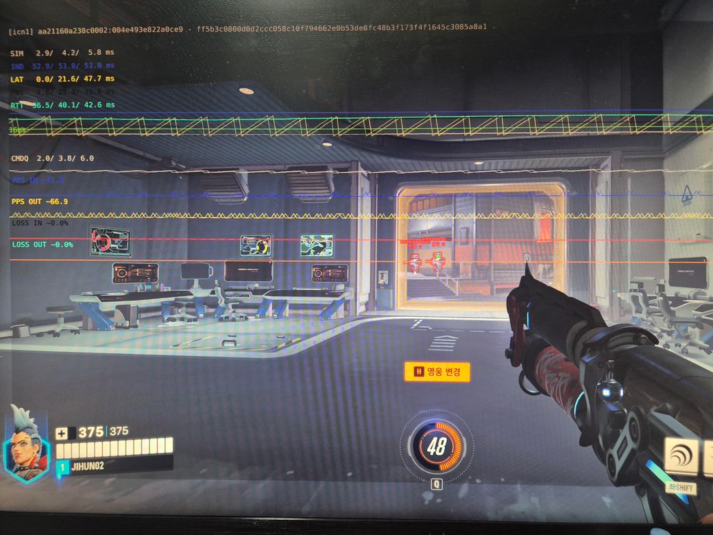 추가로 Shift+Ctrl+R을 눌러주시면 초당 프레임(FPS)와 그래픽카드 온도, 핑 등을 확인할 수 있습니다