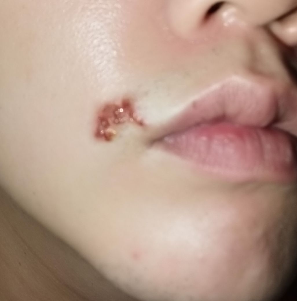 2-3일전 입술 근처에 수포?물집?이 뽀글뽀글 생겼고 현재까지 조금씩 진물이 나오면서 빨갛게 딱지가 졌습니다.