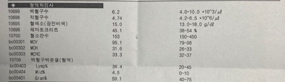 검사결과 이상 없습니다. 모든 수치가 정상범위 내에 분포하고 있습니다.
