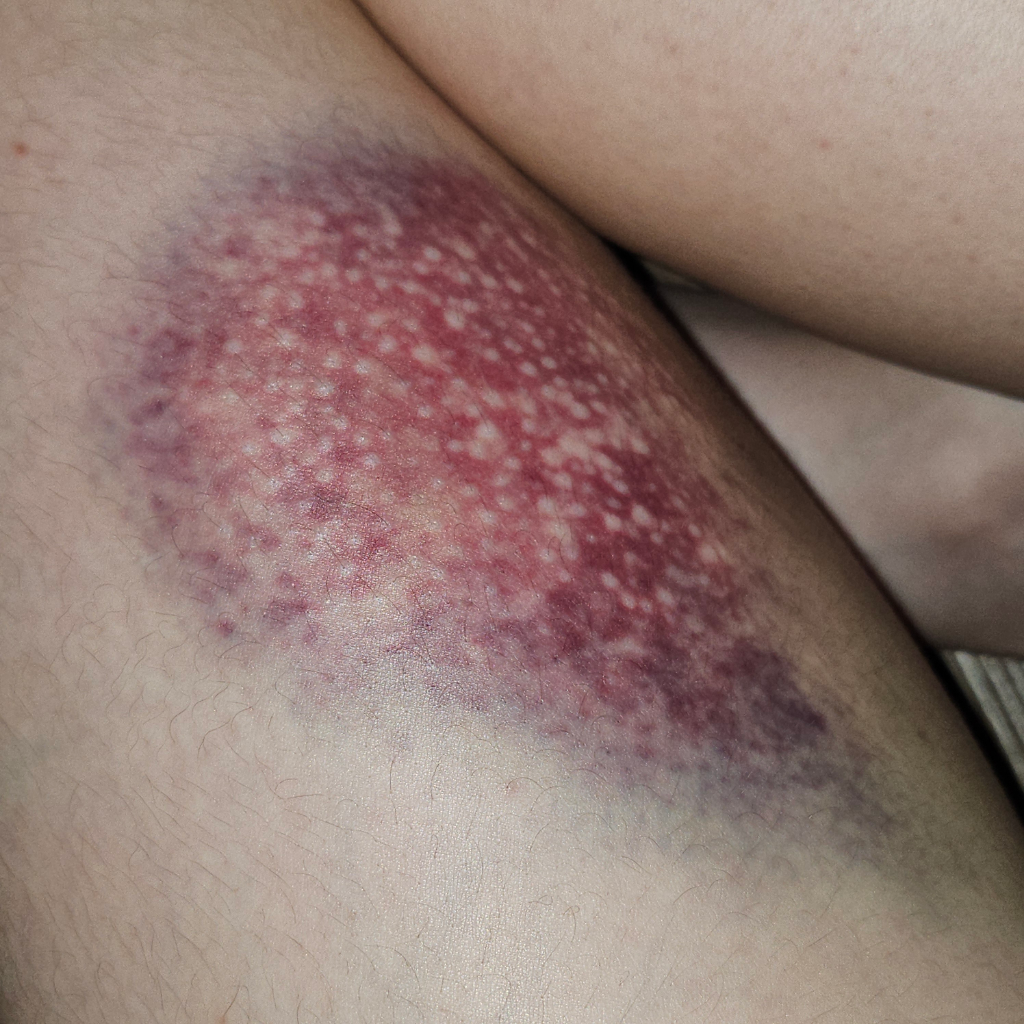 아마도 강한 충격으로 경미한 봉와직염이 동반되었을 가능성이 있습니다. 피부과나 외과 내원하셔서 적절한 치료를 받는 것을 권유드립니다.