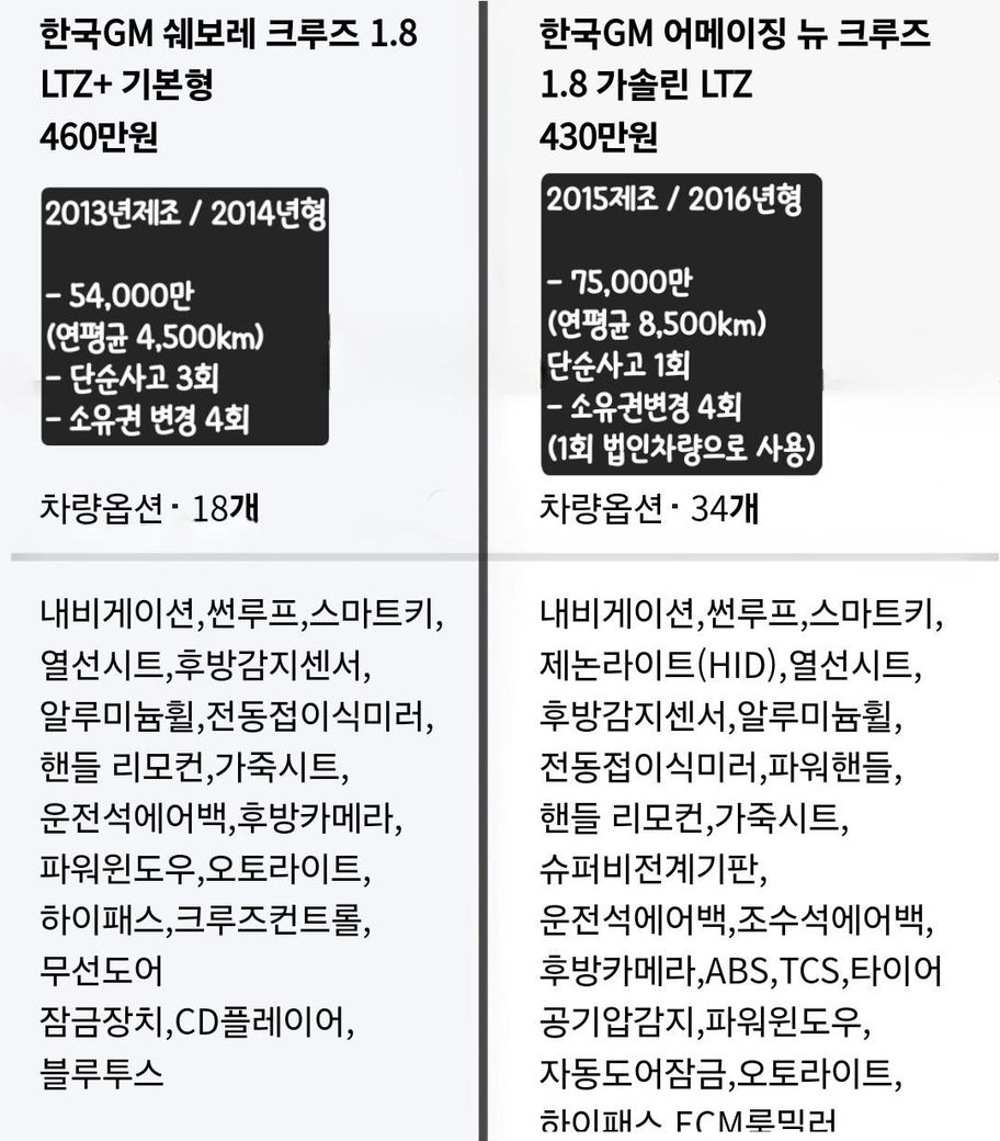 쉐보레 크루즈 차량 스펙 비교 한번 봐주세요