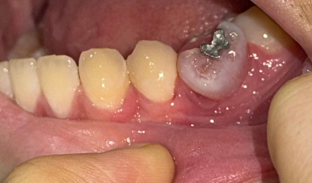 사진으로 봤을 때는 잠금 위치가 뿌리가 흡수되고 해당 부위에 잇몸이 차오르면서 내부의 붉은색이 비춰 보이는 것으로 보입니다. 불편감이 없다면 그냥 사용할 수 있지만 흔들리거나 불편감이 있다면 해당 치아를 뽑아주는 것이 좋습니다.