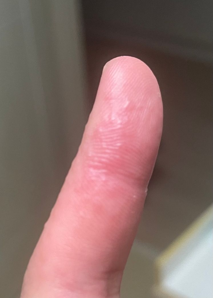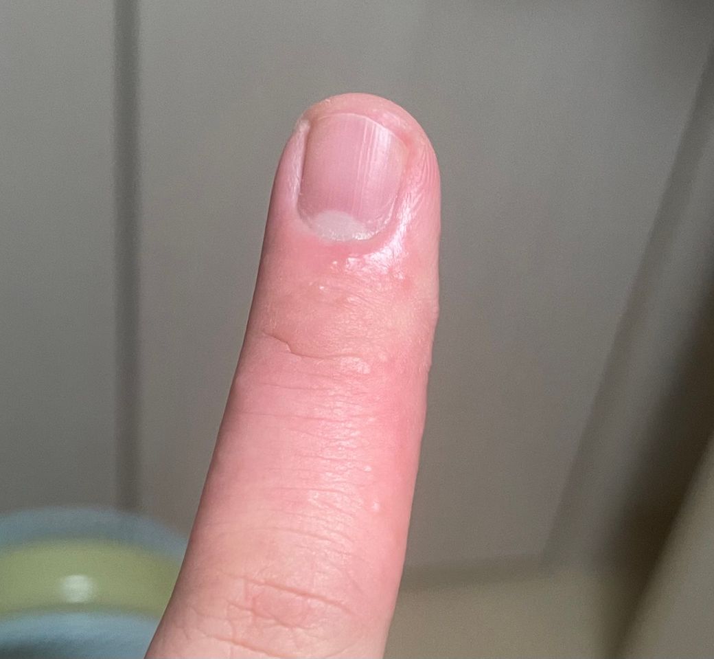 사진으로 보았을 때 한포진(pompholyx)의 가능성이 커보입니다.